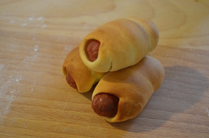 Lasciamo lievitare fino al raddoppio (poco meno di 2 ore). Dividiamo in 48 pezzi (prima a metà, quindi ogni metà in 4 ed infine ogni quarto in 4. Allunghiamo in un serpentello ed avvolgiamo i piccoli wurstel tagliati a metà per ottenere la tipica forma.