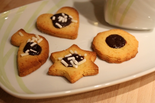 Quindi tirano la pasta frolla cercando di lavorarla il meno possibile. Con le classiche formine da biscotti la tagliano (e questo è più o meno l’unico contributo che la febbricitante piccola è riuscita a dare). Prima di togliere i biscotti dalla formina la mamma forma un avvallamento con il dito al centro di ognuno di essi. Fare questa operazione, mentre la frolla è tenuta in forma, consente di non romperla o di deformarla.