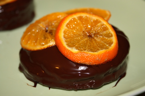 Tornando alla ricetta…quando la massa di cioccolato ha raggiunto i 27 gradi ed è quindi temperato, la mamma lo versa sopra le tortine per farne una copertura. Guarniscono con delle fettine di mandarino che mamma ha precedentemente fatto caramellizare leggermente in un pentolino con un paio di cucchiai di zucchero. Per quella destinata alla piccola G. la guarnizione è stata semplicemente della granella di zucchero. Lasciano raffreddare per qualche ora in modo che il cioccolato solidifichi per bene.