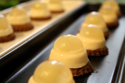 Tutto quanto detto può essere preparato anche con giorni di anticipo. Al momento di servire montiamo il dolce, sovrapponendo ai biscotti le savarin e quindi le semisfere. Le ultime due ancora congelate. Sono così piccole che dopo 1o/15 minuti a temperatura ambiente saranno pronte da servire. Ve ne accorgete facilmente perchè le gelée cambiano apsetto, diventando belle lucide.