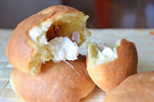 A questo punto entra in gioco la piccola G per la formatura dei panini. Prende dei pezzetti di impasto (l’ideale è di circa 35 g). Li appliattisce in dischi piatti (ma non troppo sottili), mette al centro un cucchiaino colmo di ricotta, qualche cubetto di provola e qualche cubetto di speck. Li chiude con delle pieghe sotte e da loro la forma sferica. La mollica otterrebbe un effetto migliore se la chiusura fosse fatta facendoli scivolare attraverso le dita messe a “OK” e stringendo in fondo….ma le manine sono troppo piccole 🙂