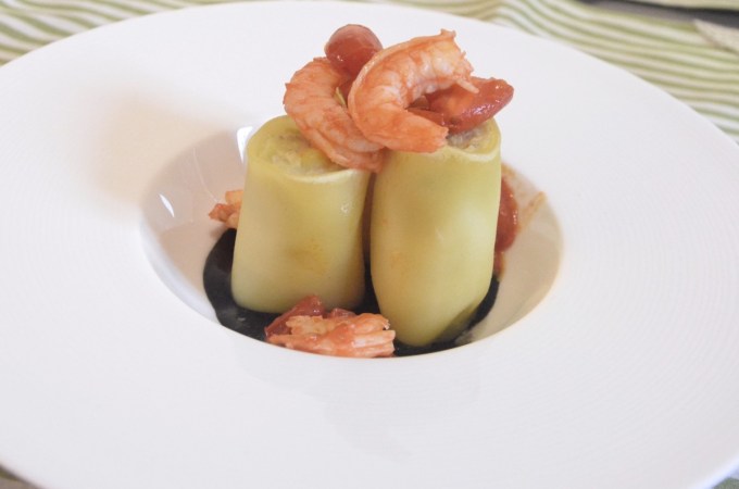 Per ora posto questa ricetta di paccheri con sugo di gamberi e nero di seppia cotti e presentati in piedi, poi alla declinazione del blog penserò…magari con l’aiuto dei lettori