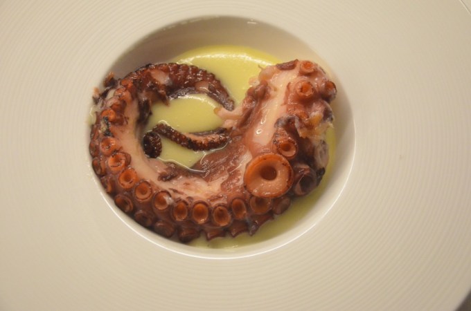 Tagliamo il polipo in parti (privilegiando i tentacoli che rendono la presentazione più gradevole) e senza pelarle le scottiamo su tutti i lati su una padella rovente con un filo d’olio, in modo da caramellizzare leggermente la pelle.